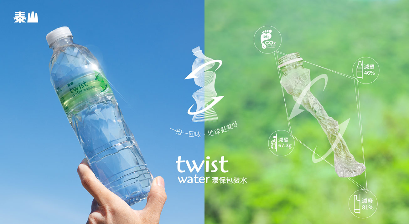 隨著全球環保意識提升,泰山企業邀請塑膠中心協助開發輕量瓶、革命性包裝水。為了降低瓶身重量,塑膠中心不但做了市售產品瓶內壓力分析,並以埔里山泉的流水為意象,突顯水質的清澈與波動。獨特的瓶型看似複雜但有其規律,就是代表泰山對生產水的要求與堅持。交錯波浪狀的設計不但增加了美感,還有容易扭轉的功能性。不論是順時針或是逆時針方向扭轉,這些特殊的交錯波浪能幫助一氣呵成,最後還緊密的交疊在一起,讓體積更加濃縮、回收空間更大。